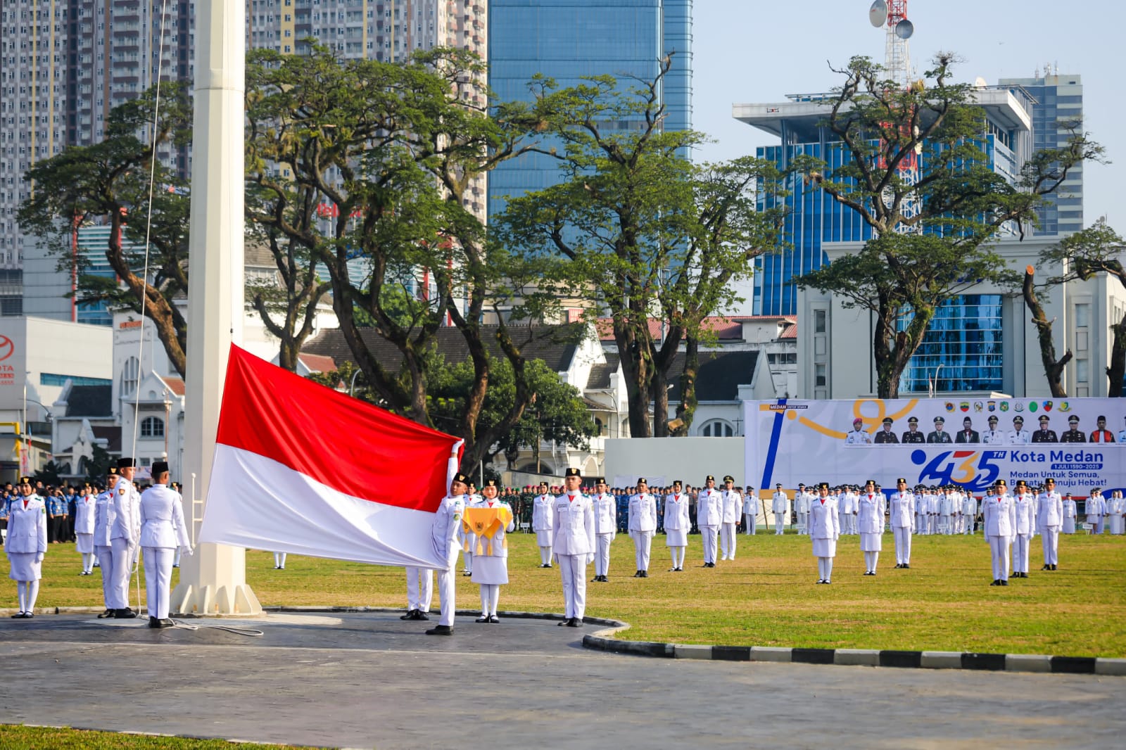 Pemerintah Kota (Pemko) Medan menggelar Upacara peringatan Hari Ulang Tahun (HUT) Kota Medan yang ke- 435 tahun. Upacara yang digelar di Lapangan Merdeka Medan, Selasa (1/7/25) ini berlangsung lancar dan khidmat.