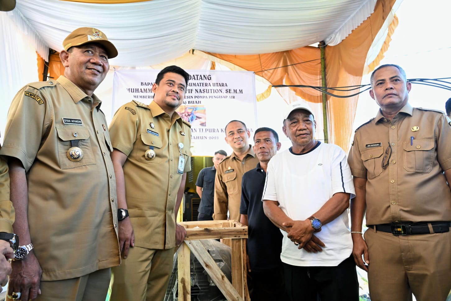Gubernur Sumatera Utara (Sumut) Bobby Nasution meninjau pengerukan sedimen waduk di Kelurahan Pekan, Kecamatan Tanjungpura, Langkat, Senin (21/7/2025). Pada peninjauannya tersebut, Ia juga menyerahkan bantuan dua buah mesin pompa penghisap air.